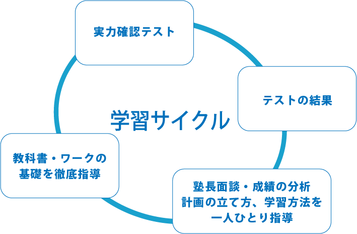 「個別指導」と「理解度テスト」「単元テスト」を繰り返し、「AI 演習」を取り入れることで学力の定着を図ります。